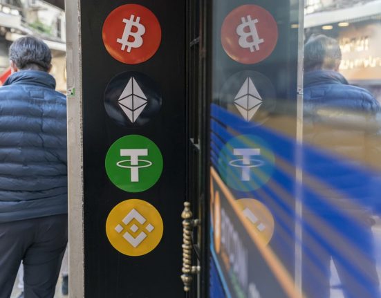 The logos of Bitcoin, Ethereum, and Tether outside a cryptocurrency exchange in Istanbul, Turkey, on Wednesday, Nov. 6, 2024. David Lombeida | Bloomberg