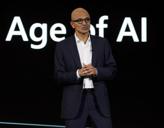 Microsoft CEO Satya Nadella speaks at a company event on artificial intelligence technologies in Jakarta, Indonesia, on April 30, 2024. Dimas Ardian |