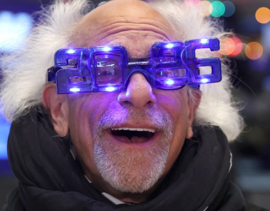 Trader Peter Tuchman wears “2026” glasses as traders work on the floor of the New York Stock Exchange at the opening bell on