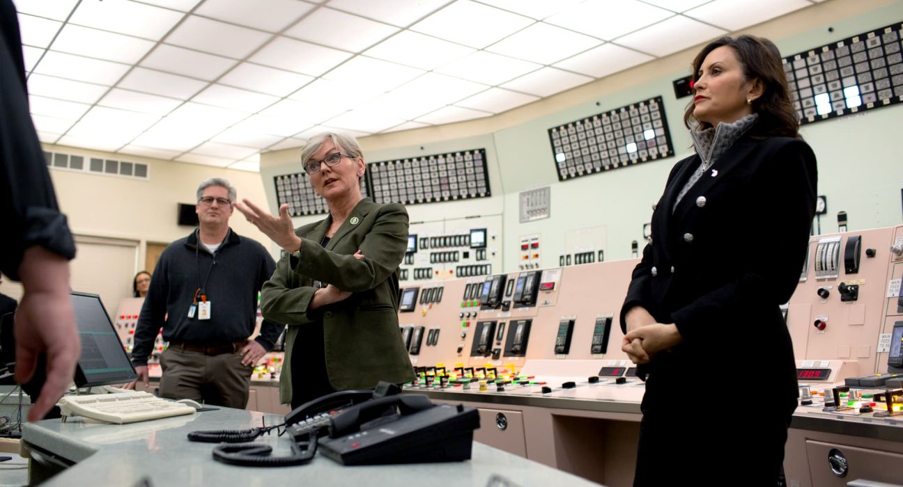 Gretchen Whitmer, governor of Michigan, right, and Jennifer Granholm, US energy secretary, center, in the control room simulator during a tour of the Holtec Palisades Training Center in Covert, Michigan, US, on Wednesday, March 27, 2024.