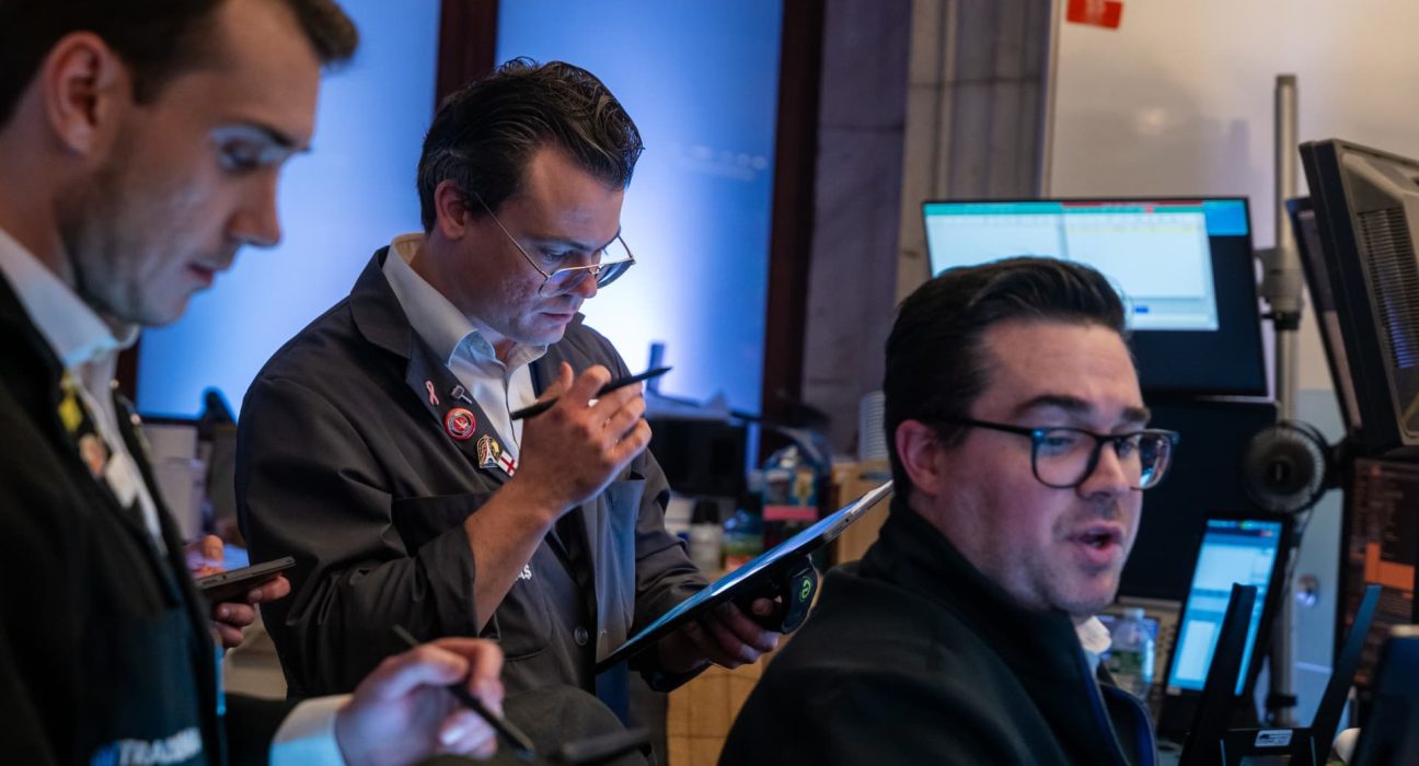 Traders work on the New York Stock Exchange floor on Feb. 20, 2025.
